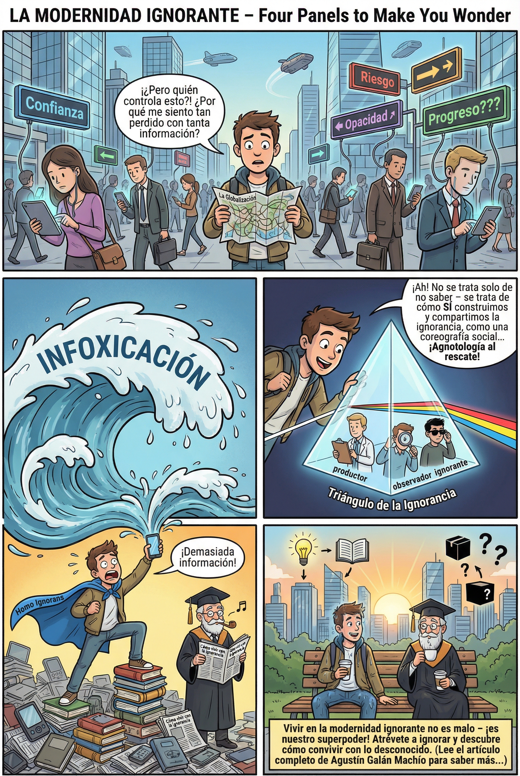 Estamos construyendo unas máquinas, unas ciudades, unas sociedades, un mundo, más inteligente que cada uno de nosotros. La pregunta es si esta socialización del conocimiento e individuación de la ignorancia supone un mayor control de nuestro futuro o si, por el contrario, nos arroja en manos de una segunda naturaleza construida que, como ha señalado Giddens, puede terminar por imponernos rumbos desbocados en una sociedad del riesgo (Beck), que puede llegar a enfrentarnos con crisis sin precedentes (¿transformativas?)
