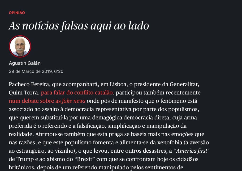 O senhor Pacheco Pereira que acompanhará, em Lisboa, o presidente da Generalitat, Quim Torra, para falar do conflito catalão, participou também recentemente num debate sobre as fake news onde pôs de manifesto que o fenómeno está associado ao assalto à democracia representativa por parte dos populismos, que querem substituí-la por uma demagógica democracia direta, cuja arma preferida é o referendo e a falsificação, simplificação e manipulação da realidade. Afirmou-se também que esta praga se baseia mais nas emoções que nas razões, e que este populismo fomenta e alimenta-se da xenofobia (a aversão ao estrangeiro, ao vizinho), o que levou, entre outros desastres, à America first de Trump e ao abismo do Brexit ao que se confrontam hoje os cidadãos britânicos, depois de um referendo manipulado pelos sentimentos de «supremacismo nacionalista” que percorrem a Europa e o mundo. Na sua intervenção neste seminário o senhor Pereira esqueceu-se, no entanto, de mencionar o “nacionalismo catalão” um claro exemplo de tudo o que estava a dizer e que tem “aqui ao lado”.